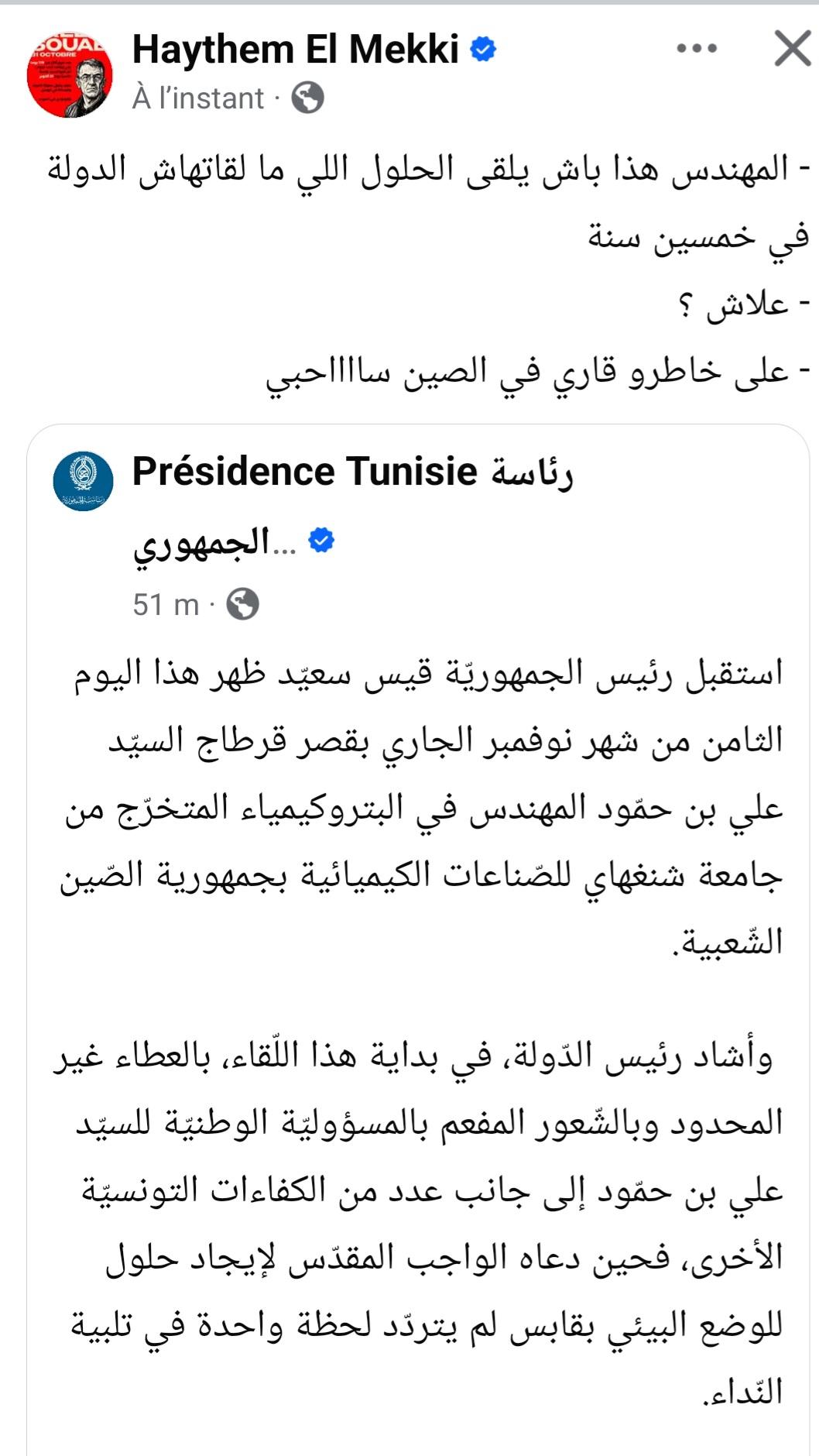 phenomeno Posté(e) November 8, 2025 at 20:01 rapport Posté(e) November 8, 2025 at 20:01 Ena elyoum tellement mekilni el stress 3addit ennhar je parcours les vidéos postees sur FB des interventions des députés. Wallahi farhdouni, il y a des perles. Citer